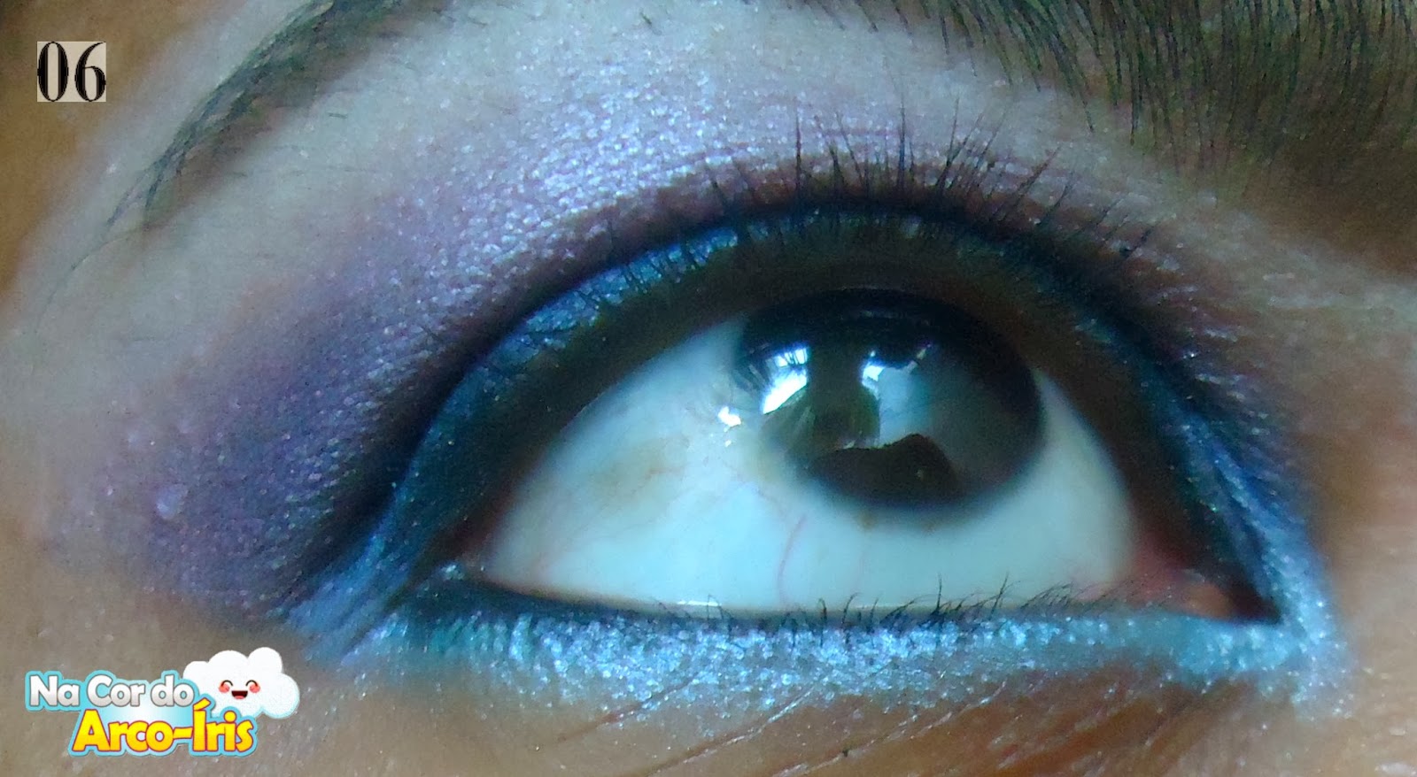 06 - Com a sombra azul clara, passe abaixo da linha dos cílios inferiores e no canto interno dos olhos, passe uma sombra mais clara, para iluminar.