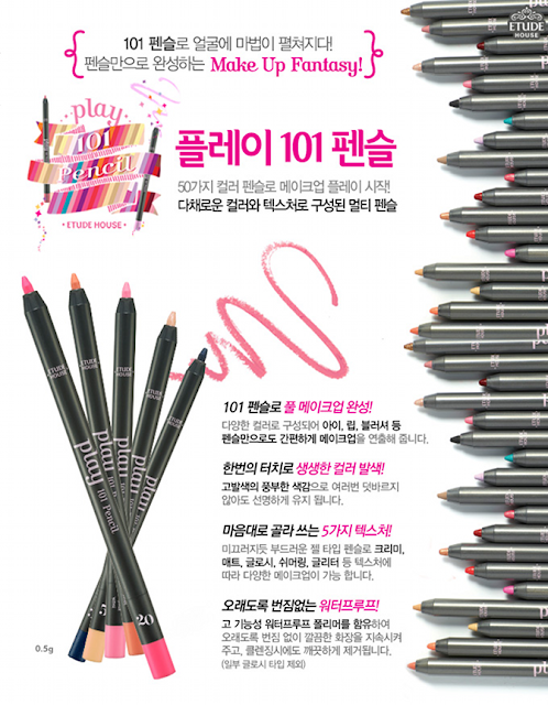 Etude House lança a coleção 101 pencil (Lápis), são 50 cores e texturas diferentes. Você pode utilizar esses lápis como corretivo, como blush, usá-lo como contorno, como um delineador, para colorir as sobrancelhas, iluminador, ou criar lábios cheios ou gradiente com eles.